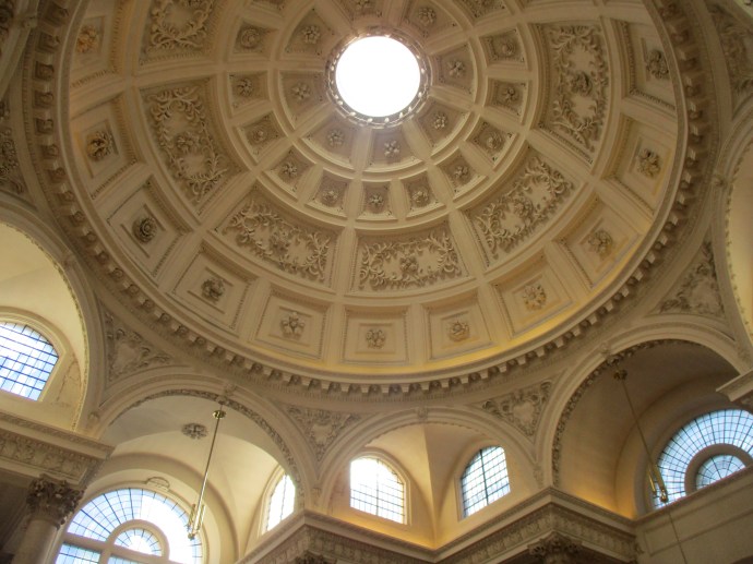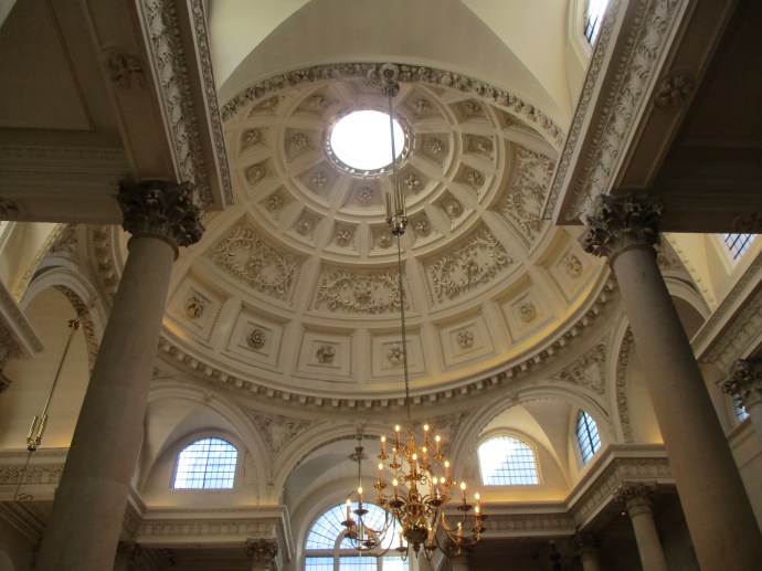 It doesn’t look much from the outside but the interior is beautiful and reminiscent of St Paul’s Cathedral – no surprise as it was at St Stephen Walbrook that Wren tried out many of the design ideas he would later implement to such impressive effect at the Cathedral.