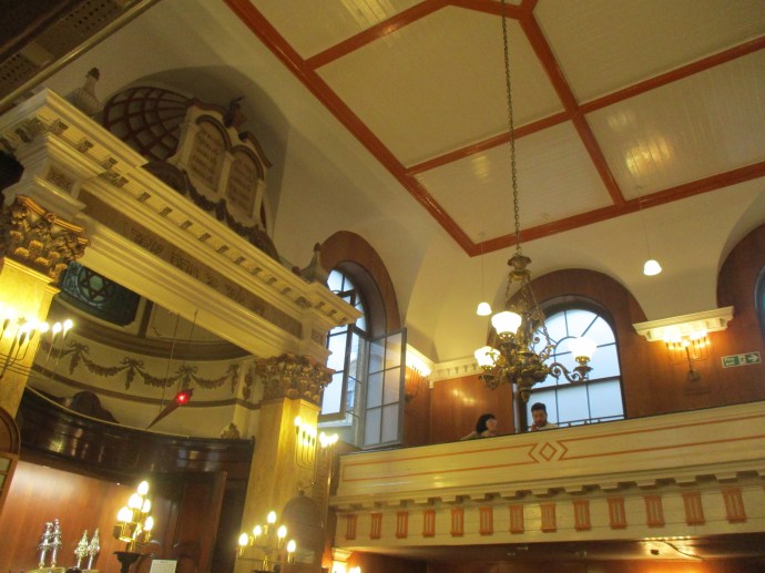 I visited Sandys Row Synagogue in Spitalfields as part of Open House London and was impressed both by the warm welcome and the interior which is much more beautiful than its exterior would suggest. The building started out as L’Eglise de L’Artillerie (the Artillery Church) in 1766 being consecrated as a synagogue in 1876 for the Dutch Ashkenazi Jews, economic migrants who had begun moving to the area in the 1840s.