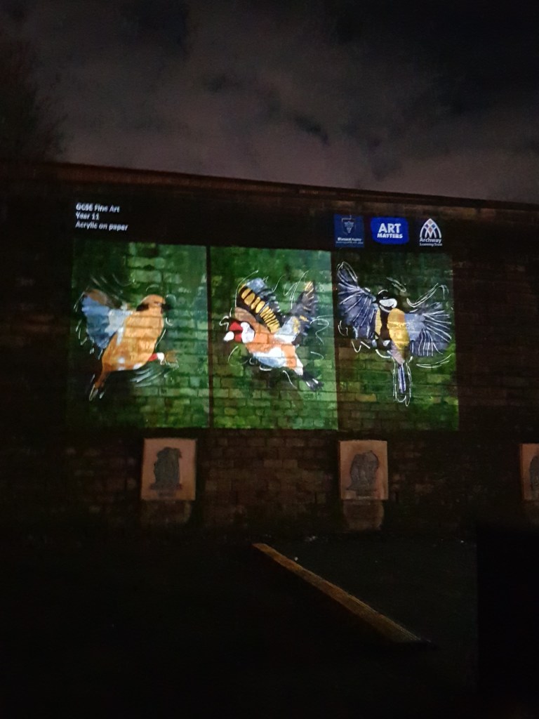 The next stop was the Robin Hood Statue by Nottingham Castle which always has some art work by children – this year were some lovely pieces projected onto the wall behind the statue. Nottingham Castle itself isn’t of course taking part this year (I realise I haven’t blogged about this but essentially after renovations costing £30 million – you may remember my visit in 2021 – in November the trust that was running it went into liquidation amidst all sorts of revelations about the frankly insane ideas of the people in charge and so its had to, temporarily, close. For instance, their business plan was built around the idea that they would get 300,000 visitors a year. Half that is probably too ambitious and much as I love its history, it isn’t even a castle it’s a manor house on the site of a castle. Then you’ve got rumours of racism and bullying and entrance fees that were far too high for what you got and every single Nottingham resident past or present I’ve spoken to about this is fuming. But, I digress…)