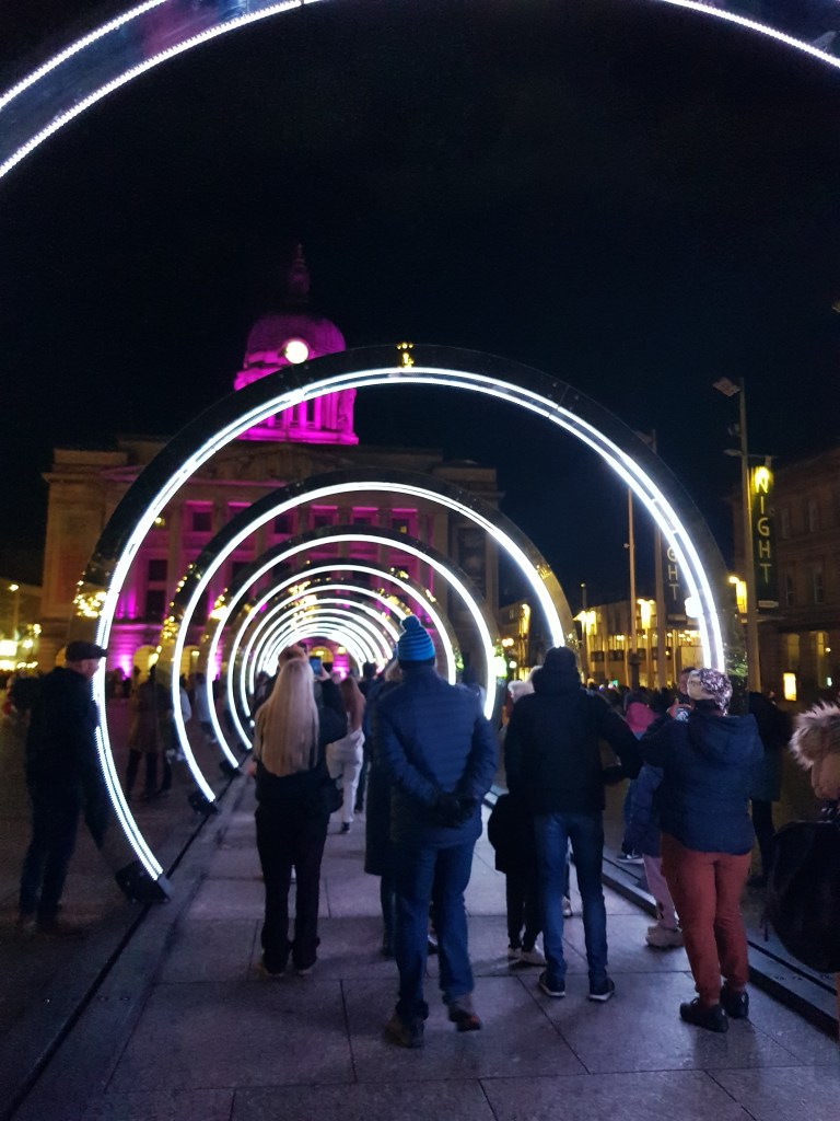 Our final stop was at PULSE in the Market Square. This was quite fun, an open tunnel that you can walk through with various light movements and music playing. I’m jealous of the official photographers who were able to take shots without people in them for the official websites, this is the best I can do to give you an idea of what it was like though I posted some video on my Instagram. It was proving extremely popular with people of all ages.