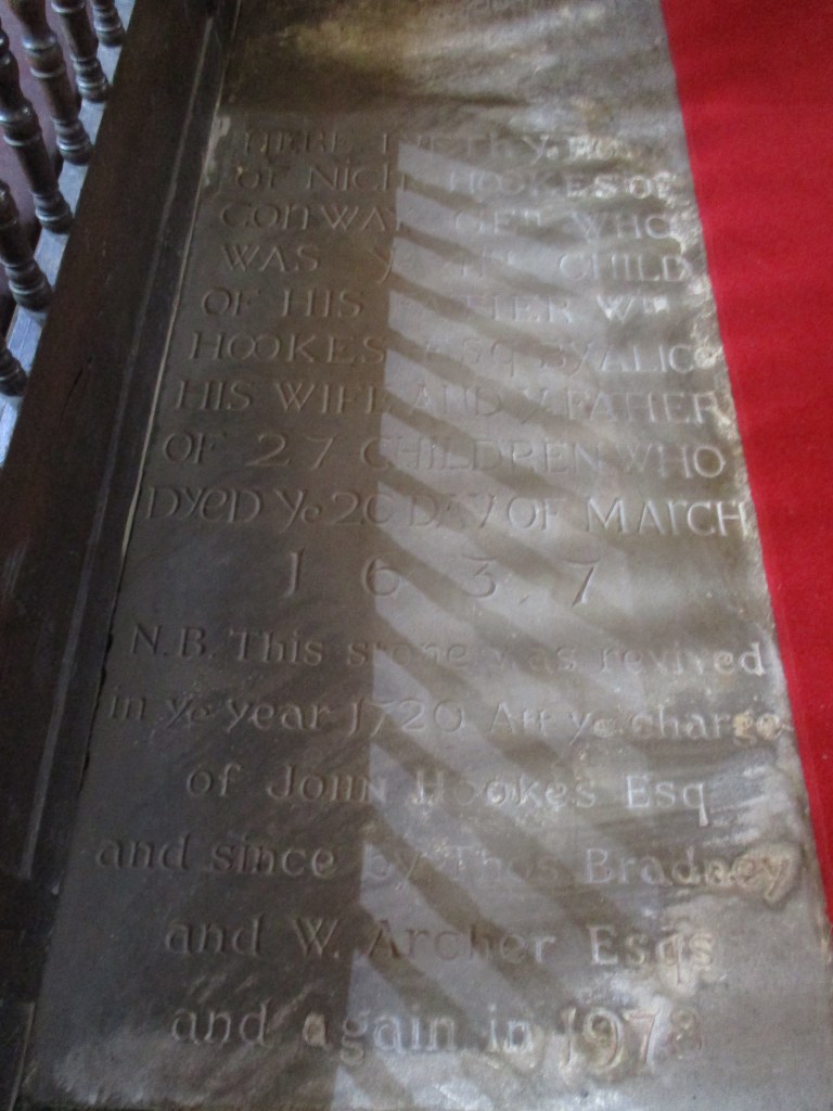 One notable grave inside the church belongs to Nicholas Hookes. The photo isn’t very clear I’m afraid but it declares that he was the 41st child of his father and went on to father 27 children of his own!