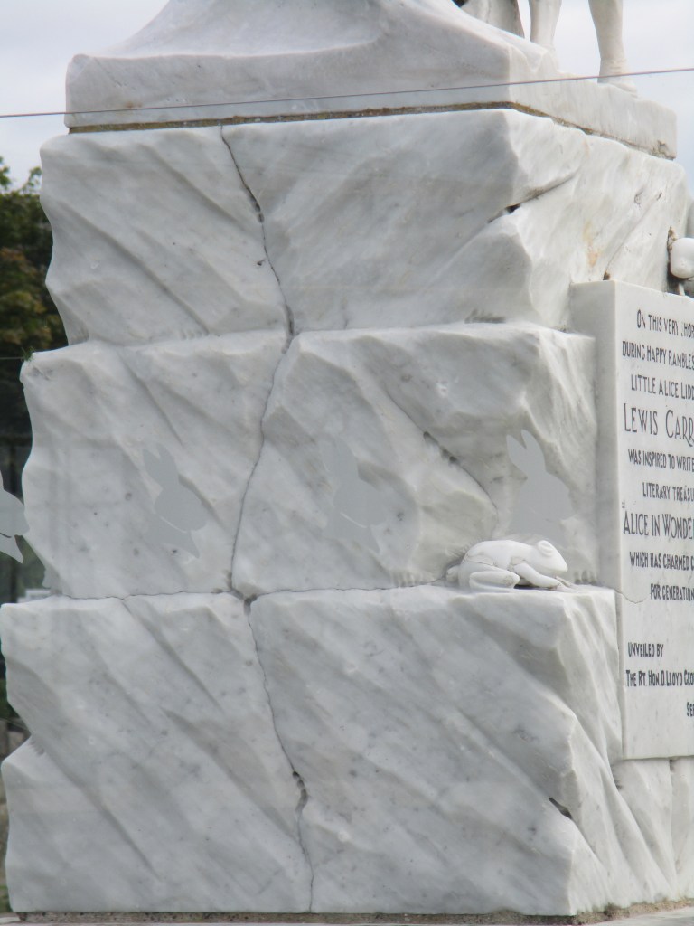 This is the newly restored version – the original sculpture by Frederick Forrester was very skillfully restored by Nick Elphick in 2012 after it was damaged by vandals and moved to its present site in 2015, after previously being by the model boating lake. It has some lovely details, not just of the coat and watch of the rabbit but for instance the frog and the squirrel on the plinth too.