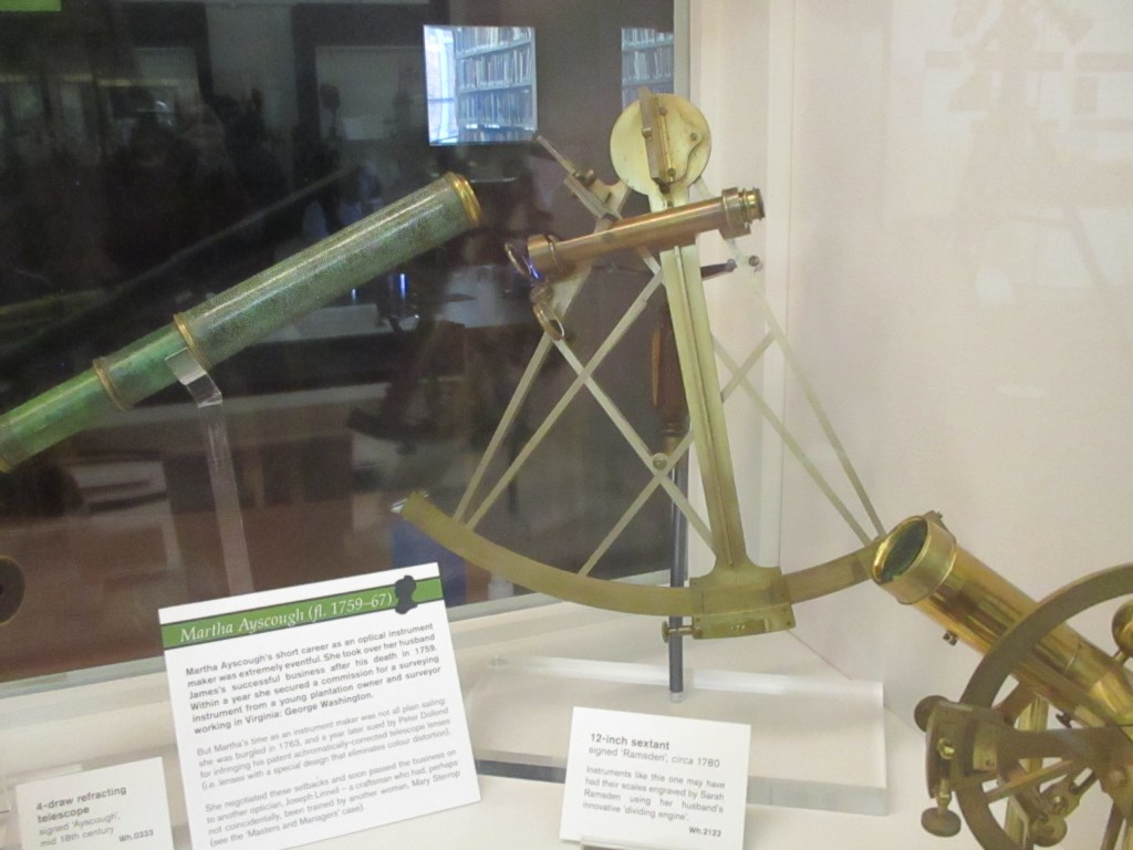 What I was particularly interested in was the display of scientific instruments that had been designed by women. This sextant (used in navigation) dates from 1780 and is signed only as Ramsden. It may not be the exact one that Sarah Ramsden, noted for her mathematical skill and her precision, designed but she was known to work alongside her father, husband and brother in manufacturing such instruments.