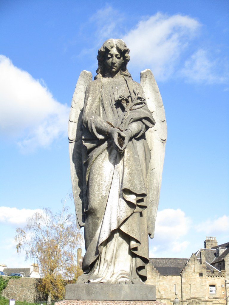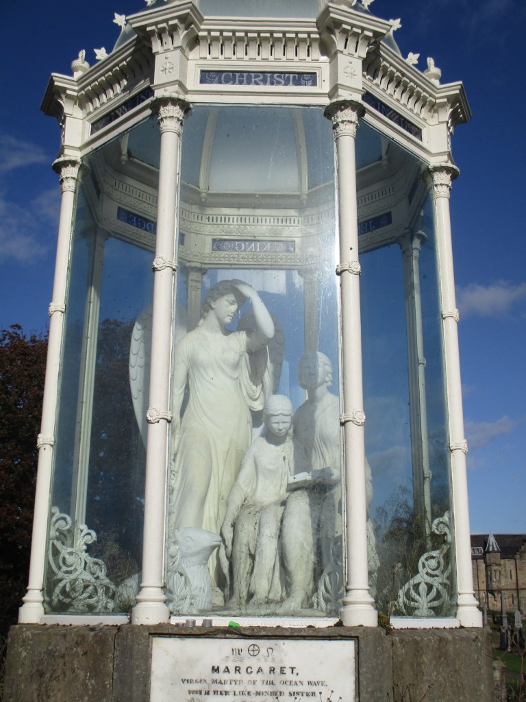 And then there’s this monument which really stands out amongst all the grey gravestones. It’s called the Martyrs’ Monument and depicts an angel protecting Margaret Wilson who is reading the Bible to her sister Agnes. Margaret along with her sister and another women were arrested and put on trial on charges of rebellion against the king (James VII) after refusing to denounce the Covenanters (Scottish Presbyterians who pledged to defend their faith against interference by the monarch). They were found guilty and though Agnes at 13 was spared, her sister was 18 and Margaret McLachlan, described as an elderly widow, were tied to stakes and drowned in the Solway Firth. A rather beautiful if ostentatious monument to a terribly sad story.