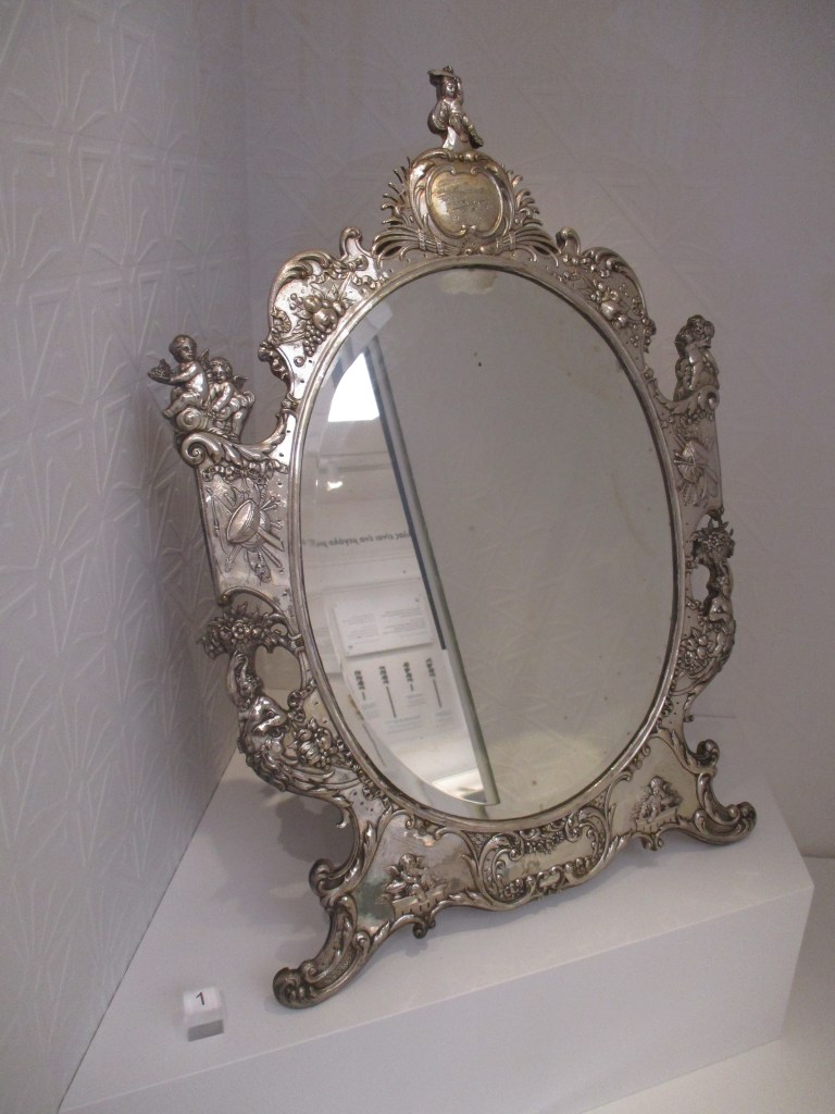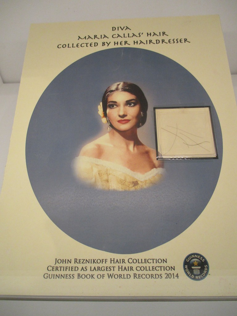 The museum presents a timeline of Callas’ life and career with videos of her performances and interviews as well as some intriguing personal items. Some of the items I particularly liked included this silver mirror from performances of La Traviata in Milan. She kept it in her living room in Paris and used it to put on her makeup.