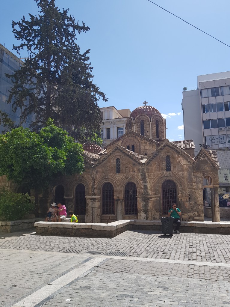 Another small church on Ermou Street, the heart of a popular shopping district, is the Church of Panagia Kapnikarea. Panagia as we’ve already seen relates to the Virgin Mary but more interestingly Kapnikarea relates to either the tax collector responsible for the church or the tax on residential buildings that produced smoke from cooking nearby. Dedicated to the Virgin Mary this church actually belongs to the University of Athens.