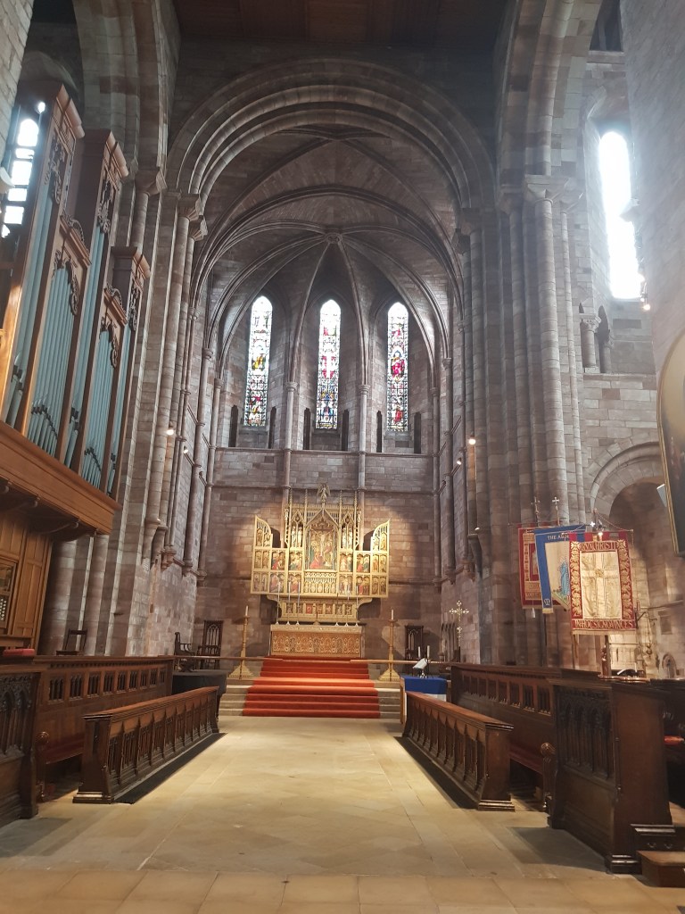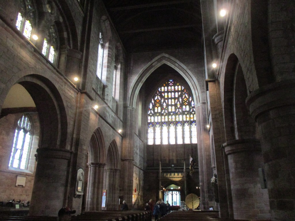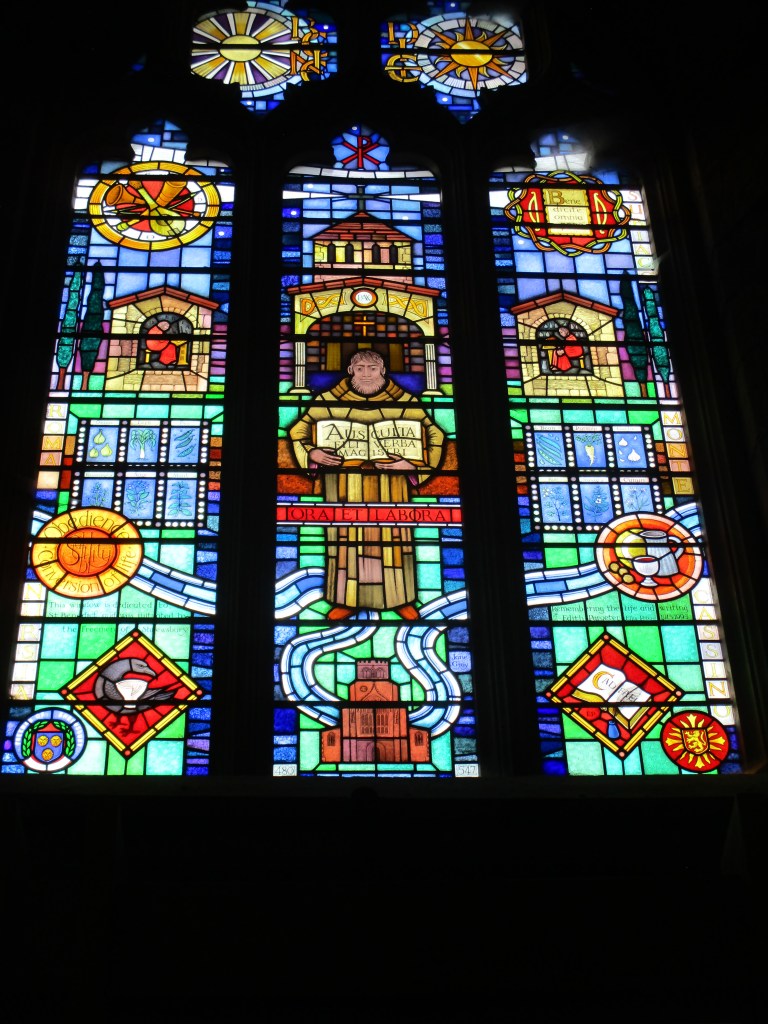 I’d heard of Shrewsbury Abbey of course which is why it was on my list of things to see in the town but I had completely forgotten that the Cadfael series of books was based there (I’ve seen the TV series with Derek Jacobi but never read any of the books). I mention this to start with because the lovely friendly volunteer who greeted me on entry was surprised that Cadfael wasn’t my main reason for visiting and directed me to a very nice stained glass window dedicated to Cadfael author Ellis Peters (real name Edith Pargeter).