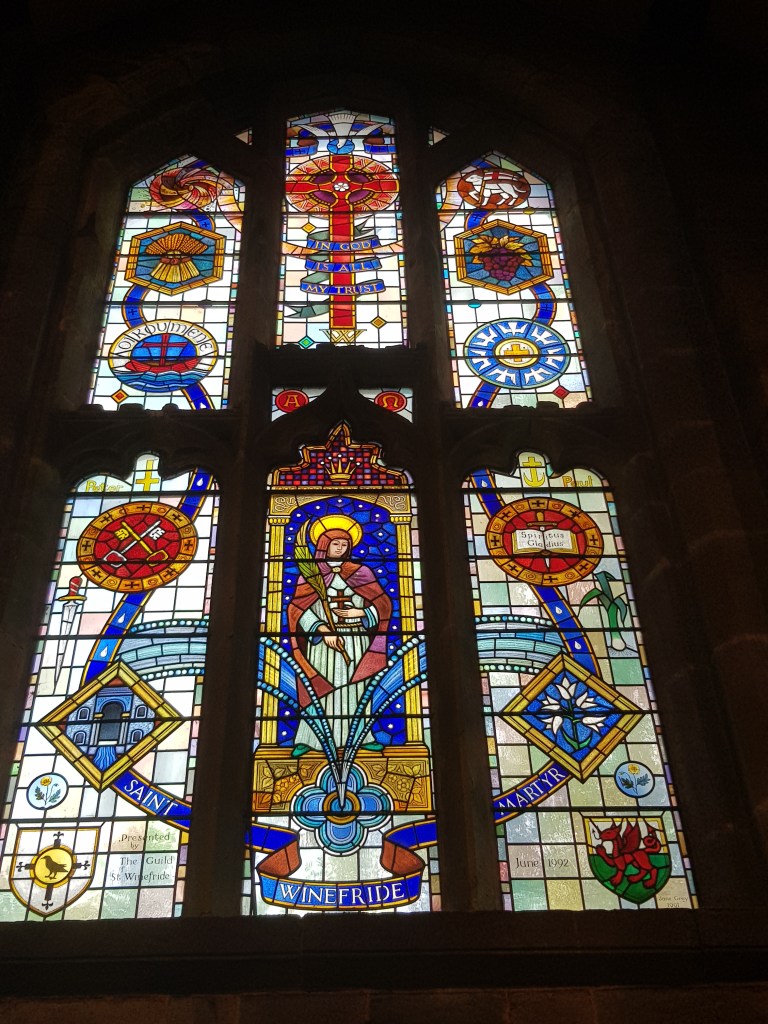 There’s lovely stained glass of course – I particularly liked this commemoration of St. Winefride dating from 1992 and made by a local artist, Jane Grey.