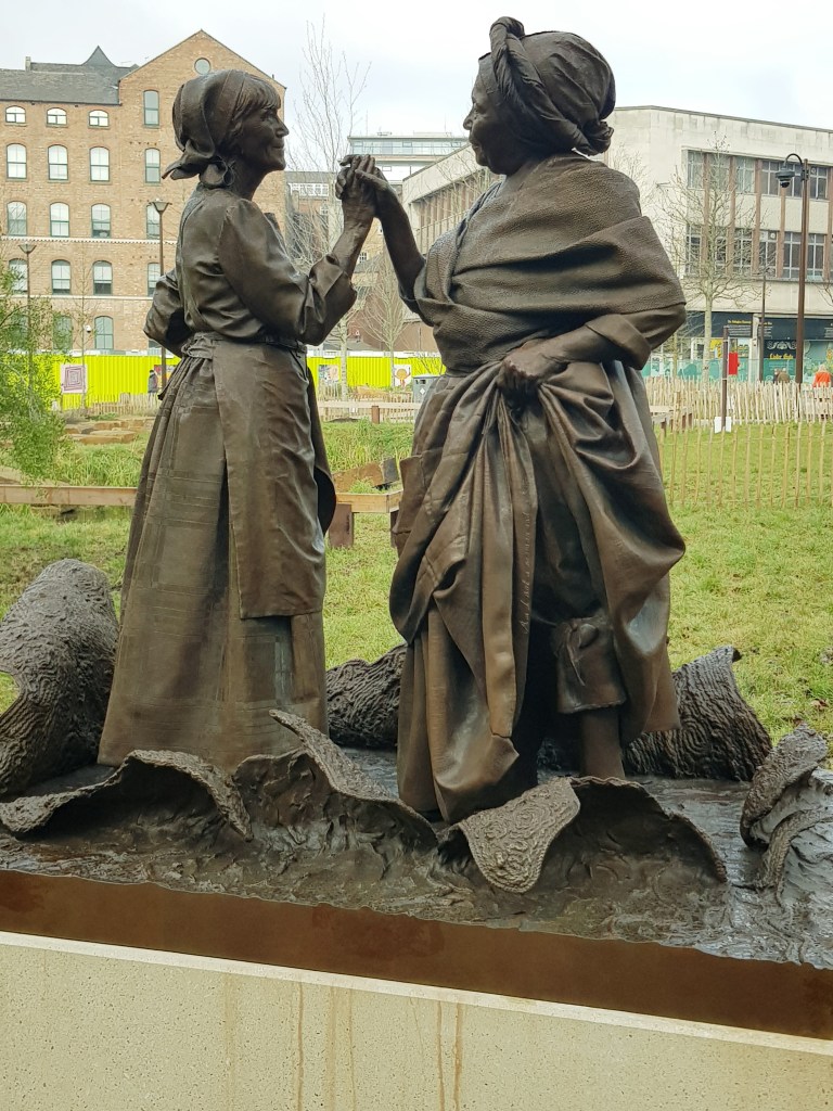 Earlier today I went into Nottingham city centre to take photos of this recently unveiled sculpture in The Green Heart, Nottingham’s newest green space near the Central Library and on the way up from the train station. The statue represents a white lace worker and a black enslaved woman greeting each other. As someone from a long line of men and women who worked in the Nottingham lace trade from working in factories to designing lace patterns the fact that none of their work would have been possible without the cotton supplied by enslaved people has never been lost on me but it’s not something that gets highlighted as much as it should and this sculpture goes some way to rectifying that as well as emphasising the contributions made by women to the economy and society in general.